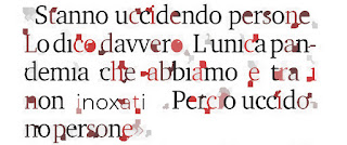“L’invisibile mutagenato ‘INCOMBE’ sul continente nordic, il più colpito! ‘CORRE’ inarrestabile, sono duemila quelli sani asintomali testati positivi dai test rileva invisibile centrifugati, crescono tutti gli indicatori artati, il tasso di positività si ‘IMPENNA’ ovunque! Ieri sono morte dieci persone, avevano tutte l’invisibile! Fate presto! Un paziente è entrato in terapica intensivistica per problemi renali, sono mille i pazienti ricoverati nel paese! E’ una catastrofe! ‘Con questi dati’ allarmanti gli ‘esperti’ si ‘preoccupano’ e i cittadini si ‘SPAVENTANO’! Fate presto santo cielo!” dice la kommissaria kom esperta psicomentale e d’invisibile contagiante.