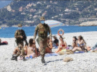 “Ma l’esercito in spiaggia, i militari in mimetica verde, gli scarponi, la pistola nel fodero e la mitragliatrice imbracciata pronta a esplodere colpi, tra i bagnanti in costume che prendono il sole, è molto preoccupante, chi ha preso questa decisione così scellerata?” domanda il giornalista. “Noi siamo militari gli ordini li prendono in alto e noi in quanto militari siamo chiamati a eseguire gli ordini senza sindacare o esprimere giudizi di gradimento, è il nostro lavoro, eseguire ordini, ci hanno detto di presidiare le spiagge in missione contro l’invisibile nemico e noi mandiamo i soldati tra la gente a ricordargli di stare distanziati e d’indossare le mascherature anche in spiaggia, all’aperto perché il nemico invisibile colpisce anche all’aperto, soprattutto all’aperto” dice il militare.