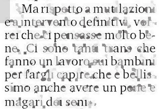 “È importante illudere i bimbi che ‘possono diventare tutto quello che desiderano essere’, non fargli apprendere i rigori della realtà, la rigidità delle catene costrittive imposte dalla natura, ma bisogna educarli a forzare la natura, a piegarla al proprio volere perverso, dobbiamo ‘proteggere’ i nostri bambini – no non è vero che proteggendoli li rendiamo fragili - perché la realtà può essere cattiva, gli esperti psicomente ci spiegano che non bisogna ferire la sensibilità dei bambini che così crescono scollegati e disadattati, fragili, perché s’illudono che la realtà debba adeguarsi ai loro DESIDERI mentre spesso e il contrario, le madri rafforzate liberate dal patriarcalismo, insegnino ai propri bambini l’importanza della ‘SCELTA’, che il sx non è per natura ma materia di ‘LIBERA SCELTA’, e la scelta va fatta da piccoli, quando l’identità sx non è ancora formata, le madri incoraggino i propri piccoli a diventare ‘donne’, spieghino ai propri bambini le gioie dell’essere ‘donna’! Spieghino ai propri piccoli che maschio o femmina non sono per natura, ma ‘SCHEMI MENTALI RADICATI, SEDIMENTATI’, dunque soggetti al ‘libero arbitrio’!” dice il kommissario kom ‘esperto’ d’invisibile infettivo e di cure medicali per riportare i bambini ‘a se stessi’.