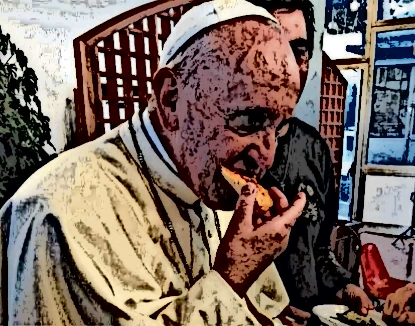“Prego, mangio ancora un po' per riempire il vuoto dell’anima mia” dice mentre mangia di gusto le brioche alla crema il santissimo patriarcale.
