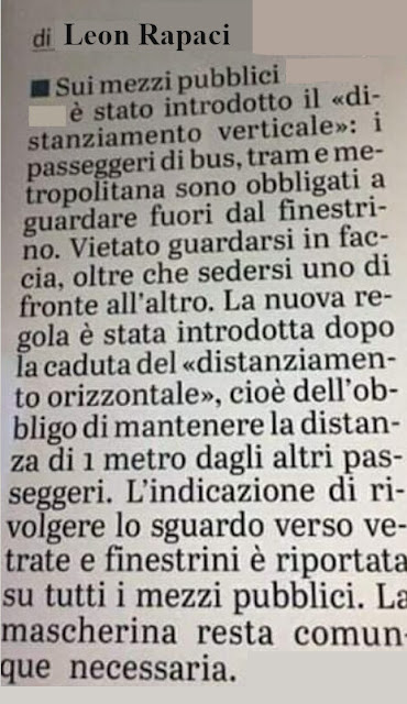 tutti dati oggettivi, inequivocabili, reali, l’invisibile nemico si diffonde come fosse la peste costantemente inarrestabile, inesorabile, ineluttabile, implacabile, inevitabile, come i flussi di stranieri clandestini del sud in ingresso al nord, ovunque si accendono , scoppiano, nuovi focolarini clusterizzati infettivi, mille mila solo nell’ultima settimana, un incremento del mille miliardo mila, una cifra spaventosa, agghiacciante, ben mille mila persone hanno starnutivo per la polvere, non riusciamo a spegnerli, abbiamo sguinzagliato i CVI, i Cacciatori di Virale Invisibile per tamponare e analizzare le persone sane, è incredibile, più testano e più trovano infettati, è così che nascono i focalari, se non facessimo i test tutto sarebbe normale, sono i test che creano l’emergenza sanitiva, sono i test che malatizzano i sani, è così che nascono i malati ma asintomatici che non hanno sintomi e stanno bene, è questa la chiave, l’ultimo focolaio è scoppiato all’interno di una ex caserma militare nordica trasformata in centro accoglitivo per clandestini illegali stranieri del sud, una scelta di valenza simbolica inenarrabile, gli invasori che si sistemano nelle caserme degli eserciti spodestati, invece di respingerli li mettiamo in caserma, alloggiati, sfamati e curati dalla collettività invasata, c’è molta agitazione, c’è molta preoccupazione, il Capo delle Res Pubblica ha costantemente il sopracciglio sollevato, è molto angustiato riguardo alla situazione salutiva della sua popolanza liberata, sono milioni i bambini non fatti nascere per diritto universale ma a lui preoccupano gli asintomatici sani senza tosse, il ministeriale salutivo, costantemente proteso nel salvataggio di vite, così impegnato nel farlo da mettere in quarantena l’intera nazione, ha persino potenziato la legge interruttiva gravidativa, le donne liberate rafforzate portatrici di diritti universalistici potranno sbarazzarsi della vita nascente in grembo assumendo una pastiglia chem-lab, scusi ministeriale salutivo ma queste non sono vite da salvare? No? No! Le vite da salvare sono quelle degli stranieri in libera invasiva e dei sani da stroncare con i protocolli medicali guarenti! ‘La norma interruttiva gravidativa che consente alle donne di sbarazzarsi di un’altra vita estranea, un altro corpo presente nel ventre, è una norma morale di civiltà etica!’, così il ministeriale, stiamo istituendo ovunque zone rosse dove la gente sana ma positiva al test virologico vive isolata e sotto stretta sorveglianza militare, tecnologica, governativa gov-lab, se le vecchiette escono a passeggiare il cagnetto sono rilevate dai droni robotici meccanizzati, multare e internate, mentre gli stranieri del sud sbarcano a migliaia illegalmente al nord ogni giorno in totalistica libertà, subito accuditi, puliti, baciati, vestiti, sfamati, frizionati, curati, accasati, accolti e integrati, invece di essere respinti, per ora è l’unica cosa che possiamo fare, isolare gli indigeni infettati sani e chiudere tutto e accogliere stranieri del sud quanti più possiamo, questa è l’unica arma che abbiamo contro l’invisibile nemico!” dice preoccupato il dottore dell’invisibile virale nemico.“E una guerra inarrestabile!” dice il giornalista.